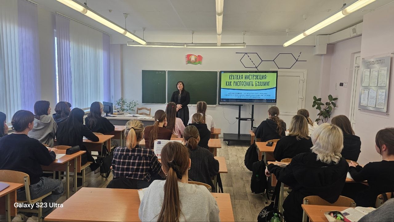 В качестве спикера выступила заместитель председателя комиссии по делам несовершеннолетних администрации Железнодорожного района г. Гомеля М.В. Асадчая. В ходе встречи Марина Владимировна разъяснила учащимся понятие буллинга, его правовые последствия и виды ответственности, которую несет несовершеннолетний за агрессивное поведение.