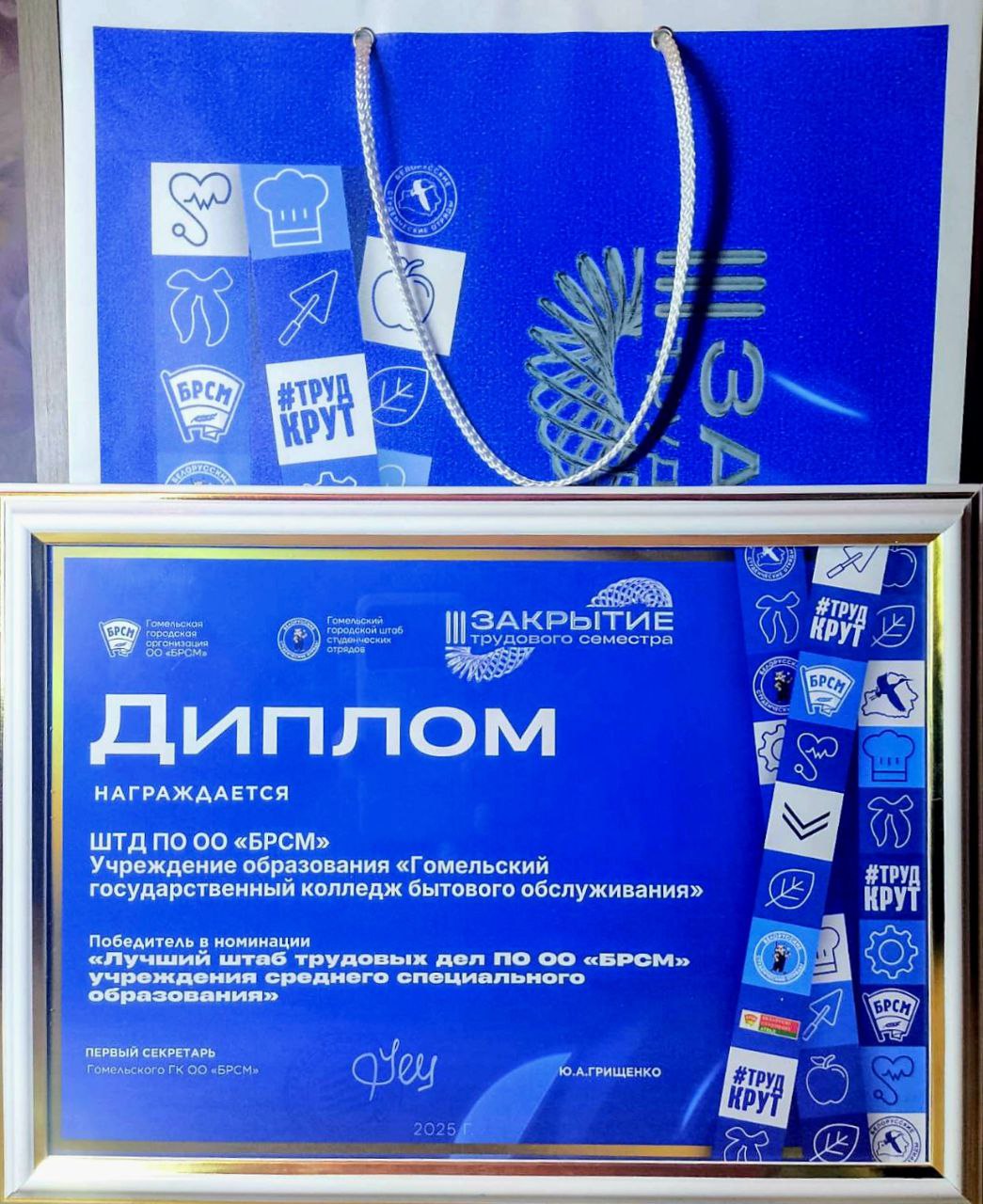 Штаб трудовых дел первичной организации ОО «БРСМ» Гомельского государственного колледжа бытового обслуживания удостоен победы в городском конкурсе. Его работа признана лучшей среди штабов трудовых дел организаций Белорусского республиканского союза молодежи в учреждениях среднего специального образования.