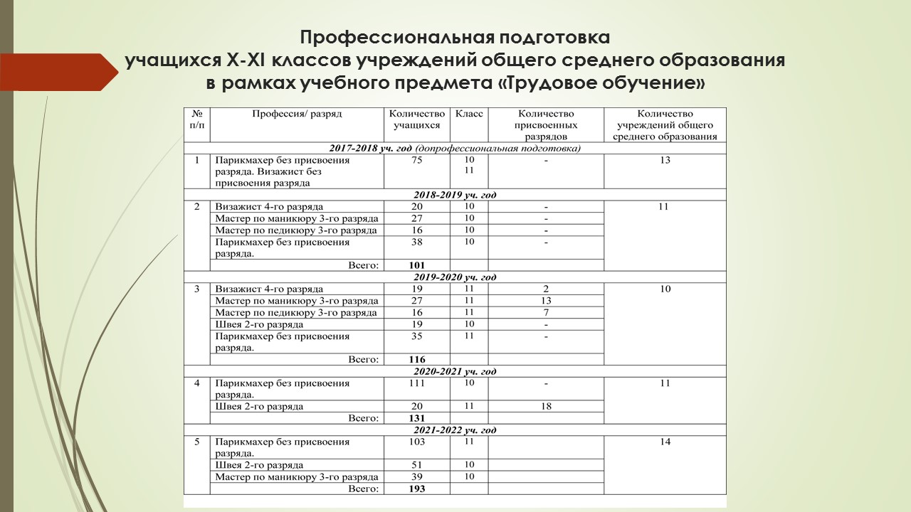 2022-2023 уч. год: 181 учащийся из 11 учреждений общего среднего образования города Гомеля и Гомельского района по профессиям: визажист, швея, мастер по маникюру.